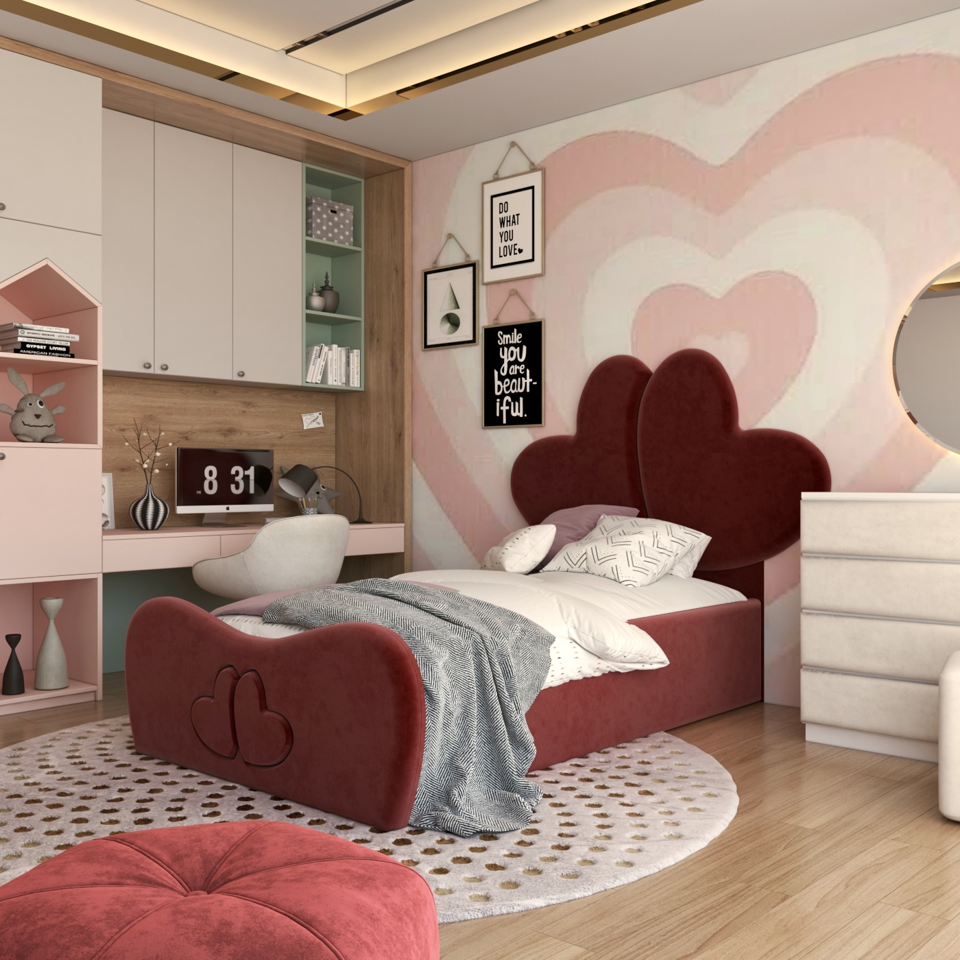 تخت خواب عروسکی و فانتزی مدل فلب مناسب کودک و نوجوان ، تهیه شده از ام دی اف درجه یک ، فوم سرد مخصوص ساخت مبلمان و پارچه مخمل مدل دیاموند میباشد . این محصول به همراه باکس پلاستیکی زیر تشک جهت قرارگرفتن تشک برروی آن ارائه میگردد . این تخت ها به گونه ای طراحی شده است که تمامی قسمت ها با فوم پوشیده شده و هیچ آسیبی به کودک شما در هنگام خواب و بازی نمیرساند . این تختها مناسب سن 2 سال تا 20 سال است و ابعاد قسمت تشک 90 سانتیمتر عرض و 2 متر طول میباشد . نصب این تختها بسیار آسان بوده و در کمتر از یک دقیقه بدون نیاز به پیچ ، ابزار و … میتوانید آن را نصب کنید . نگران نظافت این تخت ها نباشید ! پارچه مورد استفاده از نوع بهترین پارچه های روز دنیا بوده و هرگونه کثیفی به راحتی با دستمال و آب از روی اونها پاک میشود . تولید این محصول به صورت سفارشی بوده به این معنی که شما میتوانید رنگ پارچه ها ، ابعاد قسمت تشک و دیگر مشخصات تخت را به دلخواه خود سفارش دهید .