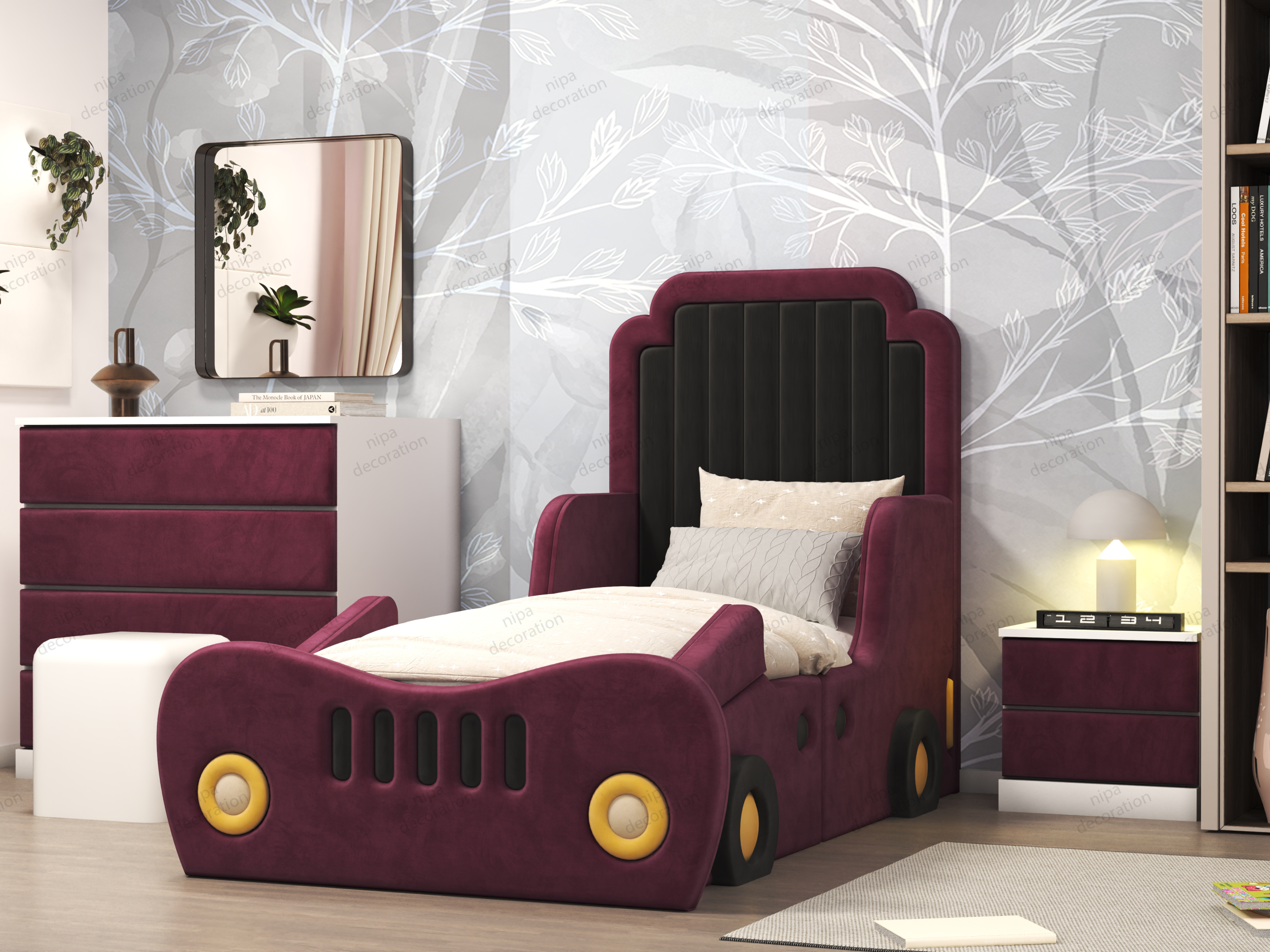 تخت خواب عروسکی و فانتزی مدل ماشین مناسب کودک و نوجوان ، تهیه شده از ام دی اف درجه یک ، فوم سرد مخصوص ساخت مبلمان و پارچه مخمل مدل دیاموند میباشد . این محصول به همراه باکس پلاستیکی زیر تشک جهت قرارگرفتن تشک برروی آن ارائه میگردد . این تخت ها به گونه ای طراحی شده است که تمامی قسمت ها با فوم پوشیده شده و هیچ آسیبی به کودک شما در هنگام خواب و بازی نمیرساند . این تختها مناسب سن 2 سال تا 20 سال است و ابعاد قسمت تشک 90 سانتیمتر عرض و 2 متر طول میباشد . نصب این تختها بسیار آسان بوده و در کمتر از یک دقیقه بدون نیاز به پیچ ، ابزار و … میتوانید آن را نصب کنید . نگران نظافت این تخت ها نباشید ! پارچه مورد استفاده از نوع بهترین پارچه های روز دنیا بوده و هرگونه کثیفی به راحتی با دستمال و آب از روی اونها پاک میشود . تولید این محصول به صورت سفارشی بوده به این معنی که شما میتوانید رنگ پارچه ها ، ابعاد قسمت تشک و دیگر مشخصات تخت را به دلخواه خود سفارش دهید .